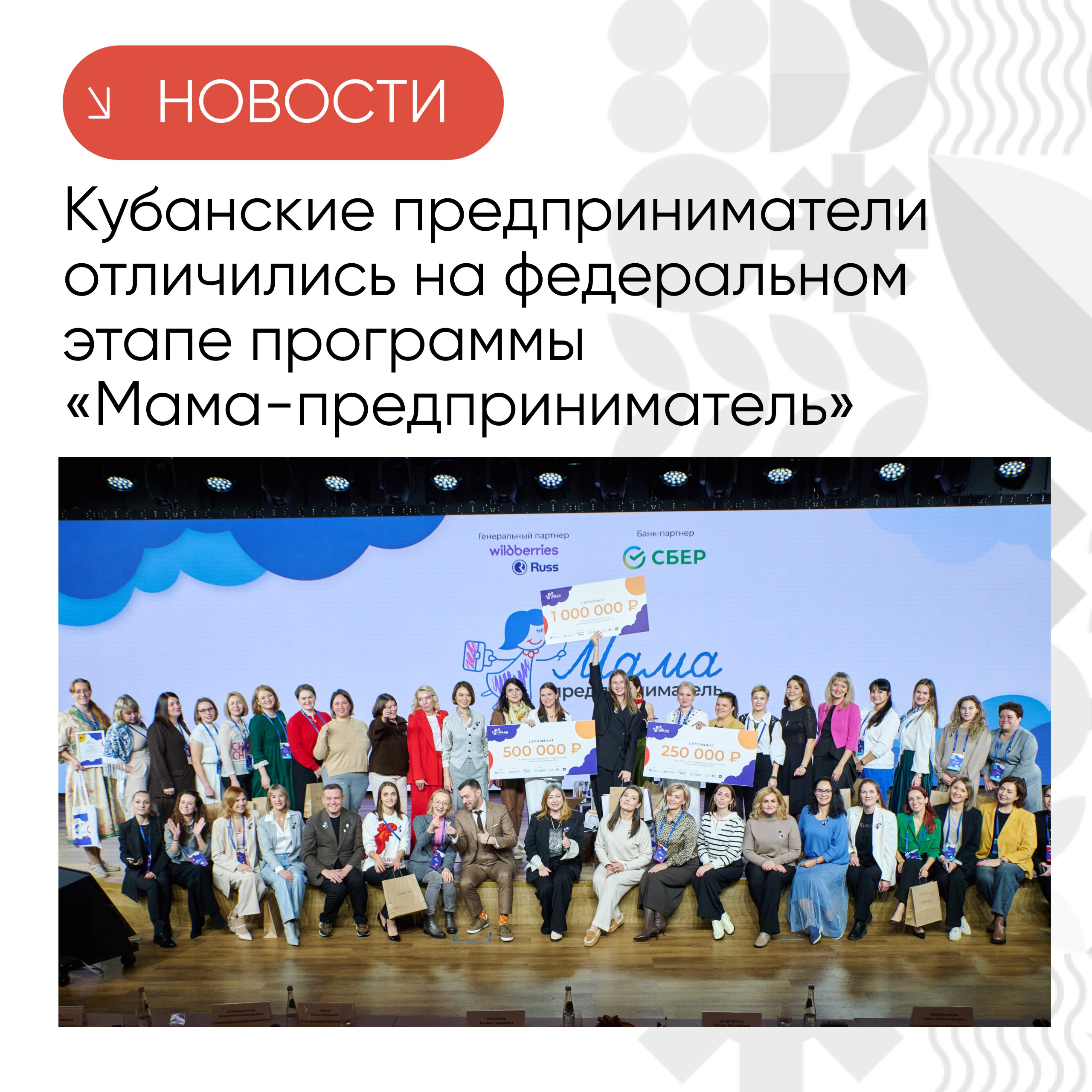 25 женщин «прокачали» свои идеи или действующий бизнес, получили обратную связь от экспертов и поборолись за грант в 1 млн рублей на развитие своего дела. Краснодарский край на конкурсе представили Валентина Баканова и Алена Гарматина.